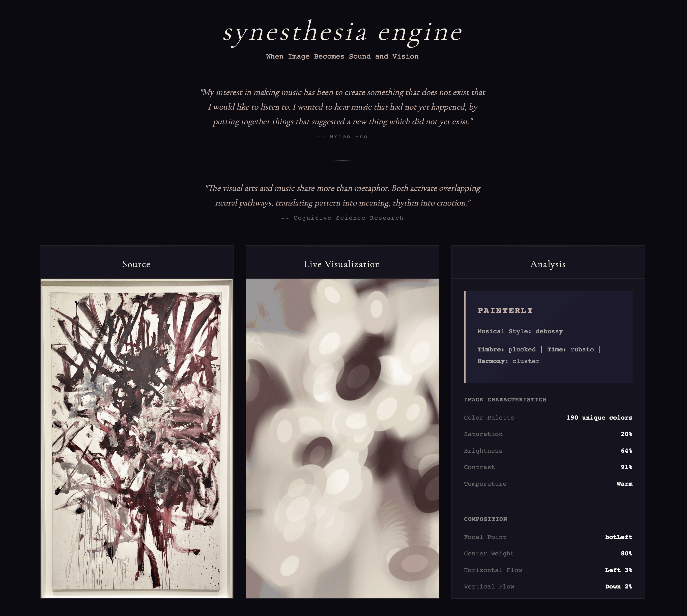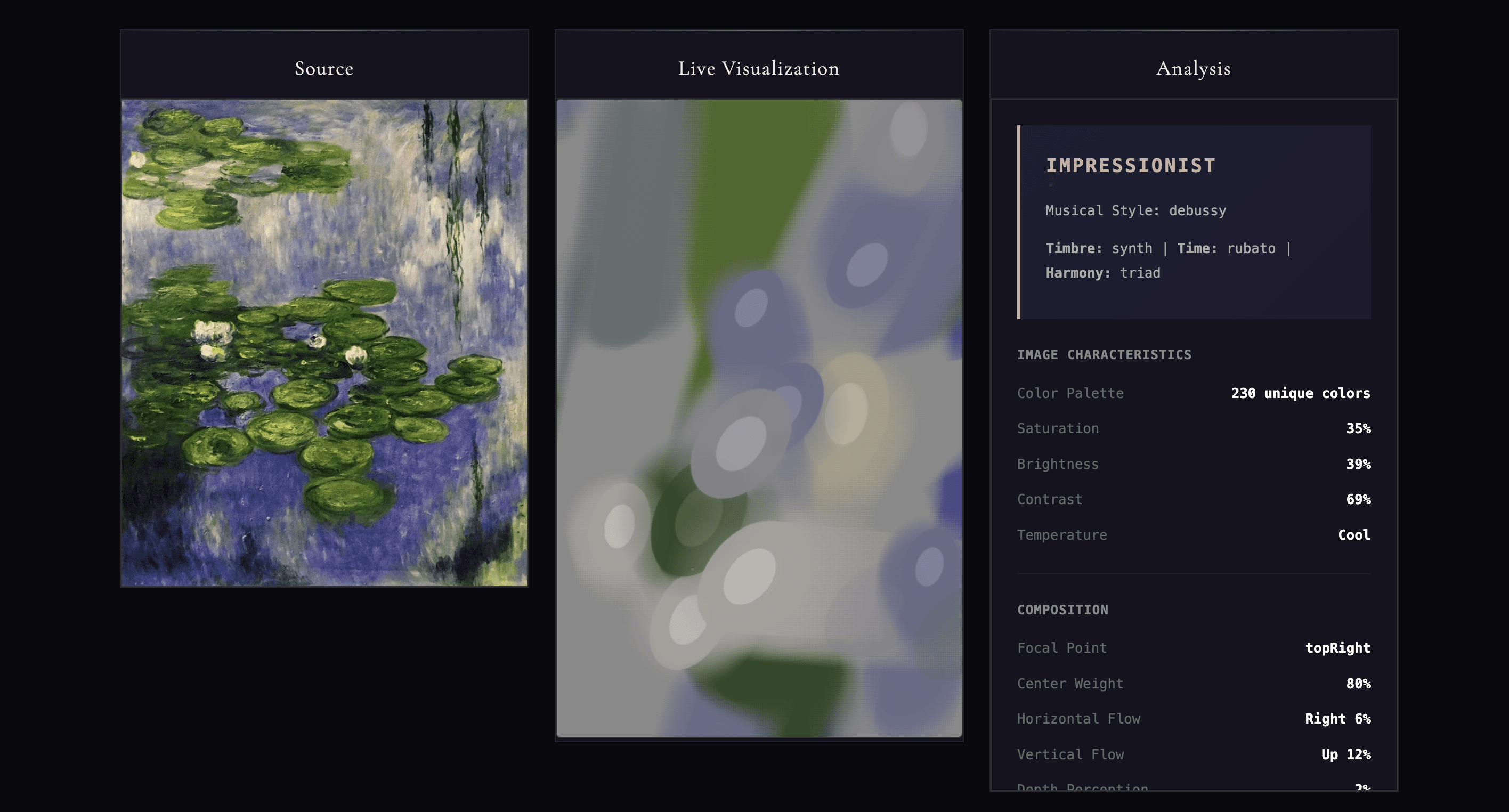 Built with vanilla JavaScript and the Web Audio API. Image analysis extracts color palettes, edge angles, texture variance, spatial distribution, and compositional focal points. Aesthetic categorization uses threshold combinations (e.g., texture + saturation + softness for impressionist detection) to identify artistic contexts, then maps these contexts to appropriate musical styles using sound theory. Each aesthetic gets its own scale (pentatonic, whole tone, mixolydian, Phrygian, etc.) and chord voicings (9ths for Debussy, suspended for ambient, triads for classical). Everything runs client-side. No backend. No data collection. Just you, your image, and a system that's actually trying to understand what kind of art it's looking at before deciding how it should sound.